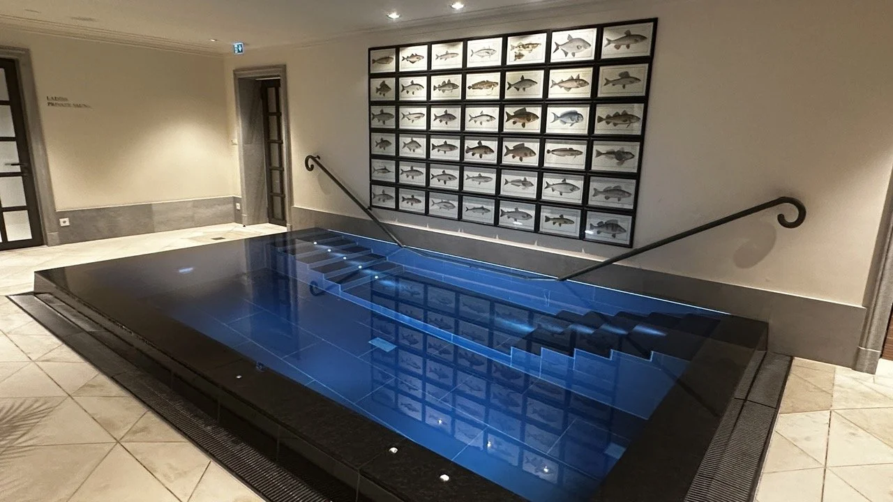 The serene cold plunge pool in the Sauna at Brenners Park-Hotel, featuring sleek black tiles and stylish aquatic decor, offering a relaxing retreat for guests.
