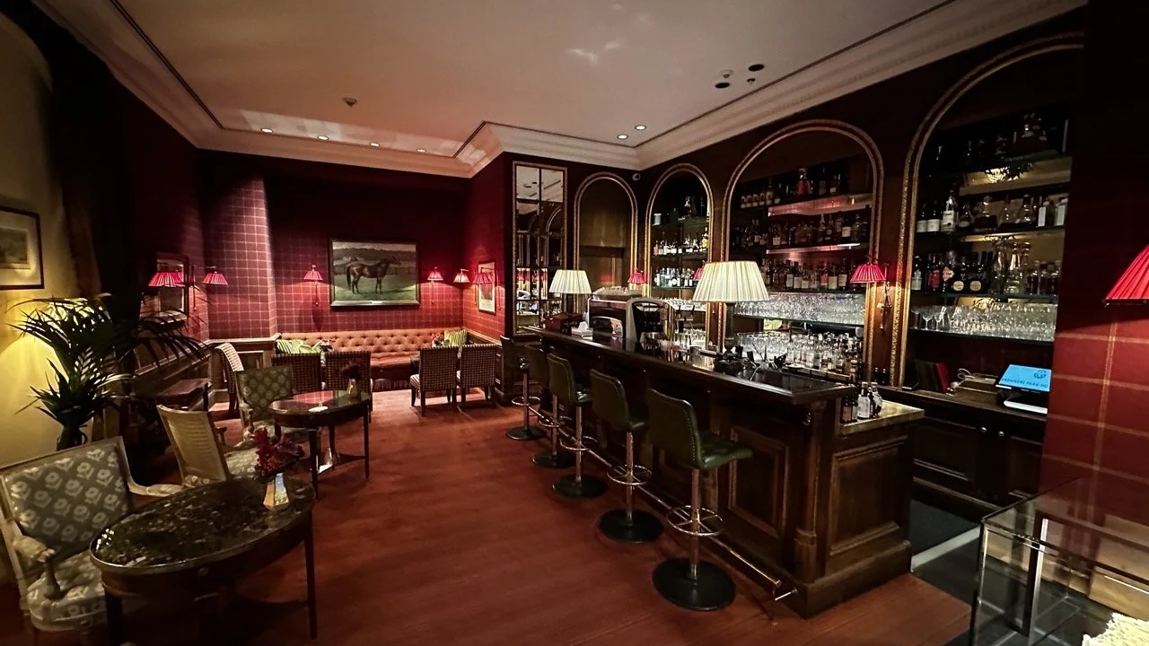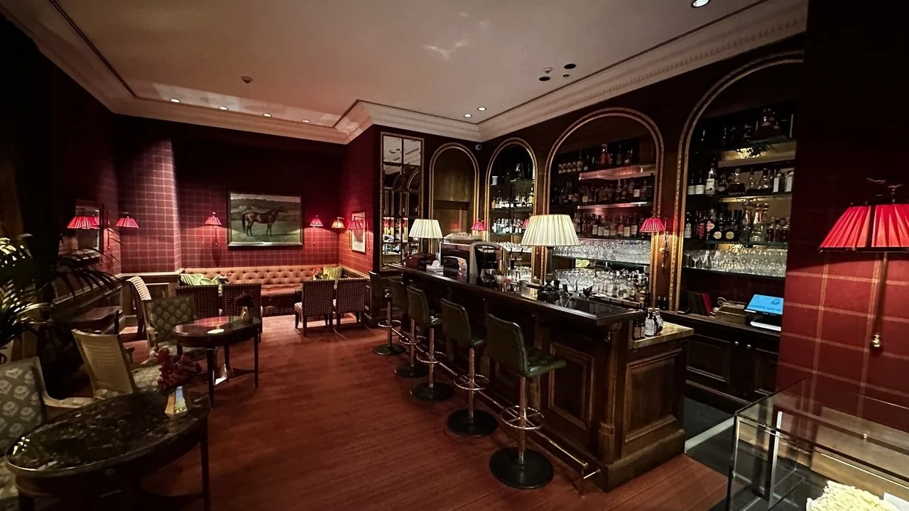 The inviting Oleander Bar at Brenners Park-Hotel & Spa, featuring rich red walls, elegant furnishings, and an array of premium spirits, perfect for pre-dinner drinks.