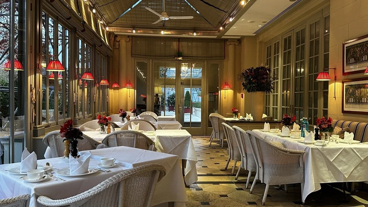 The light-filled Wintergarten at Brenners Park-Hotel & Spa, adorned with white tablecloths, red lamps, and garden views, creating the perfect setting for a refined culinary experience.