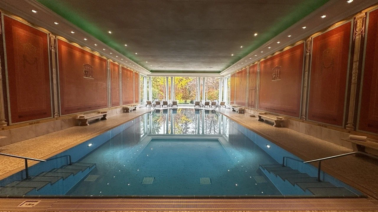 The breathtaking indoor pool at Brenners Park-Hotel & Spa, surrounded by classical red and gold panelled walls, exuding timeless elegance and tranquillity.