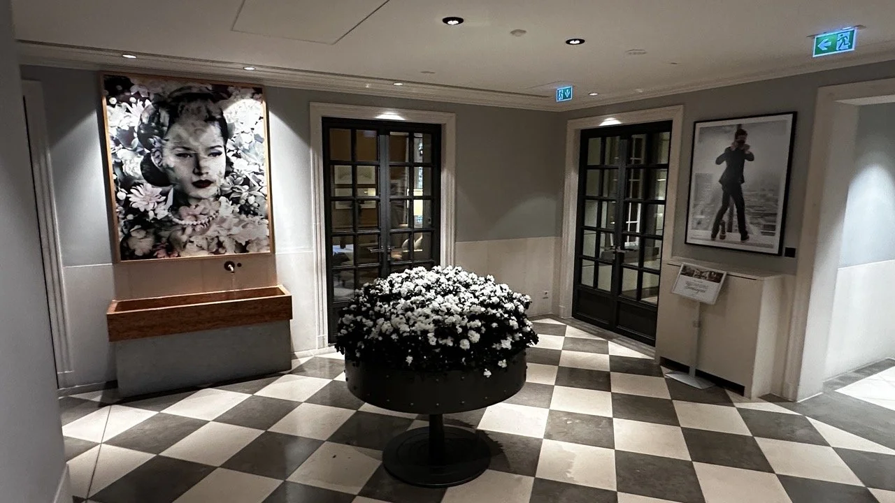 The tastefully decorated reception at Villa Stephanie, showcasing modern floral artwork and luxurious interiors that reflect the hotel's artistic sensibility.