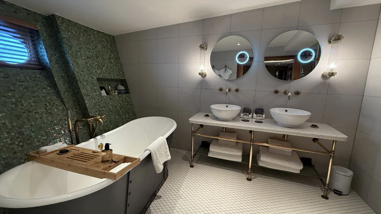 I’m always pleased to find a bathroom with twin sinks, and Fingal delivered — with style. The space was impressively large, featuring a deep, freestanding metal soaking tub, a huge walk-in shower, and a separate WC. Underfloor heating ran beneath classic white tiles, while the sloping hull wall and shower were finished in elegant green glass mosaic, adding a refined nautical touch.