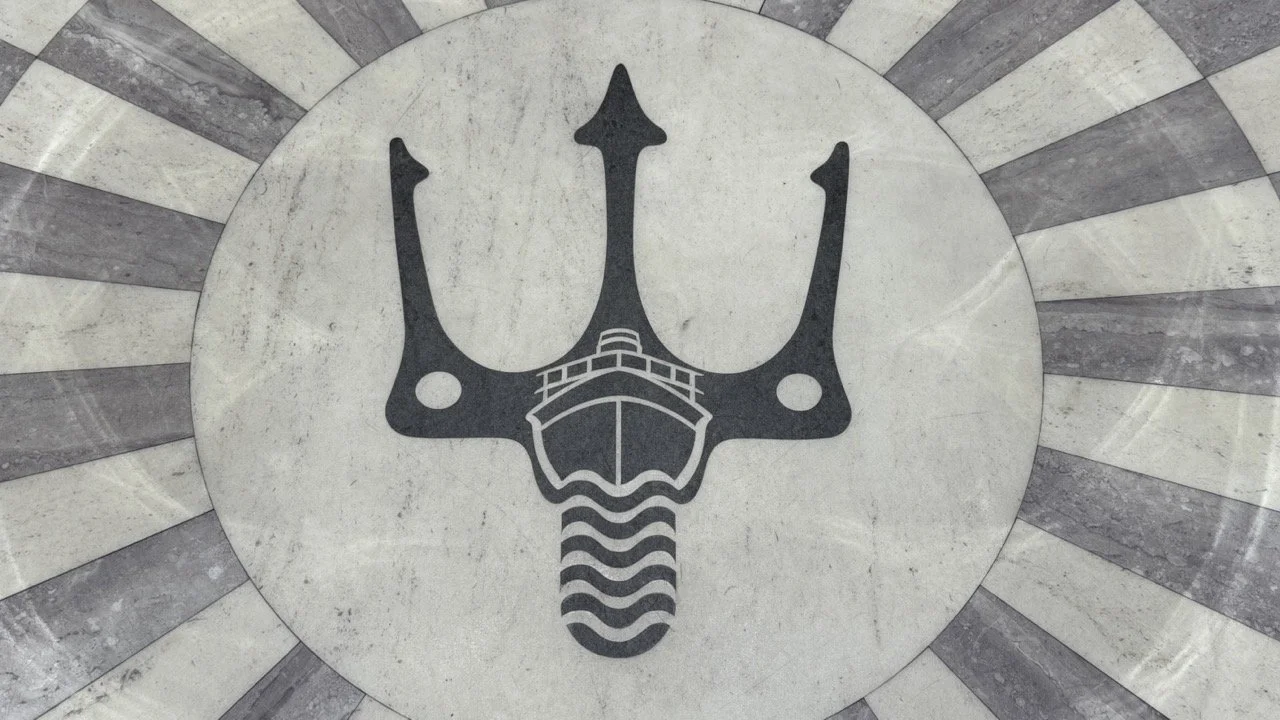 Fingal’s signature trident and ship emblem inlaid in marble on the upper deck.