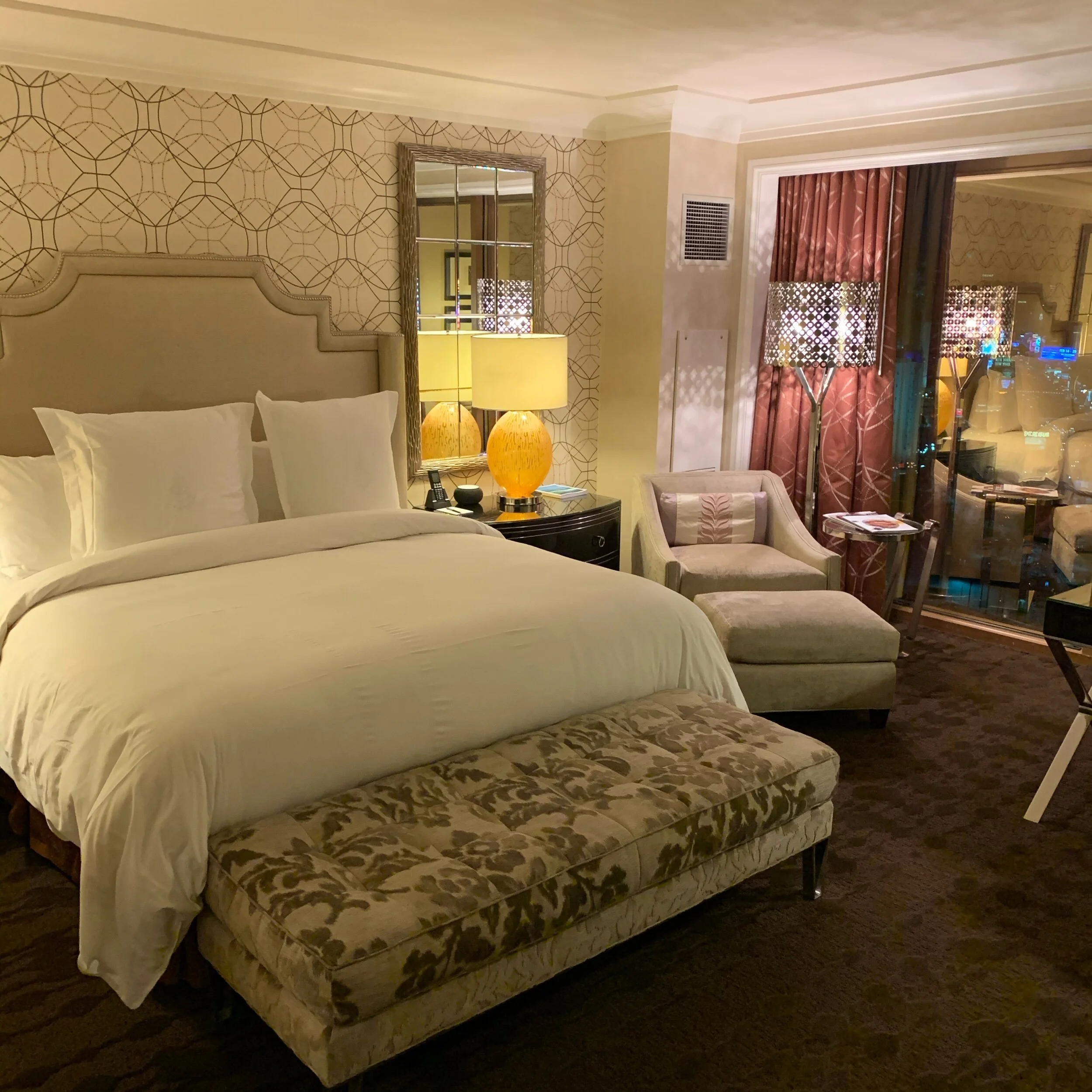 We had a Strip-View - this was 500 sq. ft. (46 m2) with an incredibly comfortable king-size bed (amazingly soft pillows and beautiful bedding linens). There was a large en-suite bathroom (separate shower cubicle and WC off the main bathroom) - one of the key highlights was the L’Occitane (Amande) toiletries; the only disappointment was only having one sink in a bathroom size that could easily have accommodated two. There was ample space, excellent Wi-Fi, a large writing desk and chair as well as occasional seating and just the most incredible view over the strip, day and night.