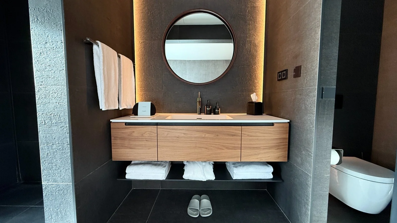There was the freestanding tub, walk through rain shower, and exclusive Blue Lagoon Ritual skincare amenities - shampoo, conditioner, shower gel, bath salts, and body lotion. Beautifully clean and I loved the design combination of the dark slate tiled floors and walls, adjustable lighting yet softened by the natural wood (walnut?) doors and drawers accents.