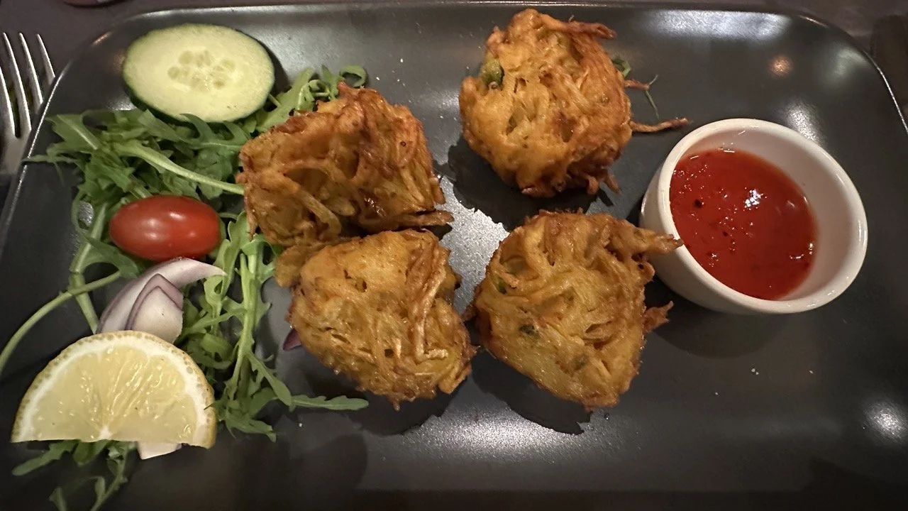 Golden, crispy vegetarian pakoras served with a fresh side salad and a sweet chilli dipping sauce at Cilantro Restaurant.