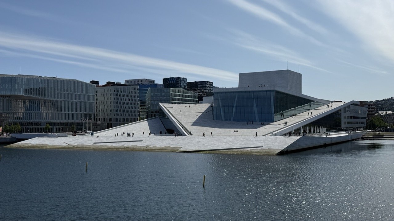 The iconic Oslo Opera House seen from the water, with its dramatic sloping roof and modern glass design.