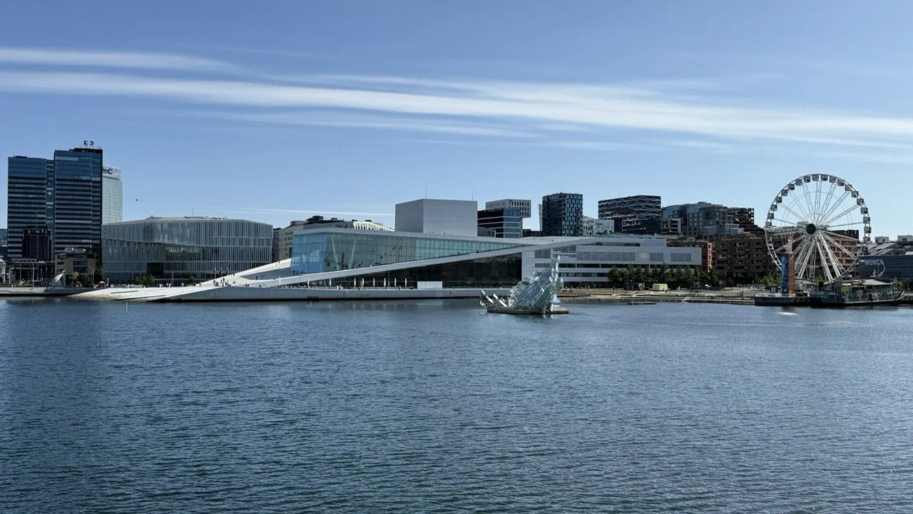 Panoramic view of Oslo’s Barcode District with the Opera House, glass sculpture, and Ferris wheel along the waterfront.