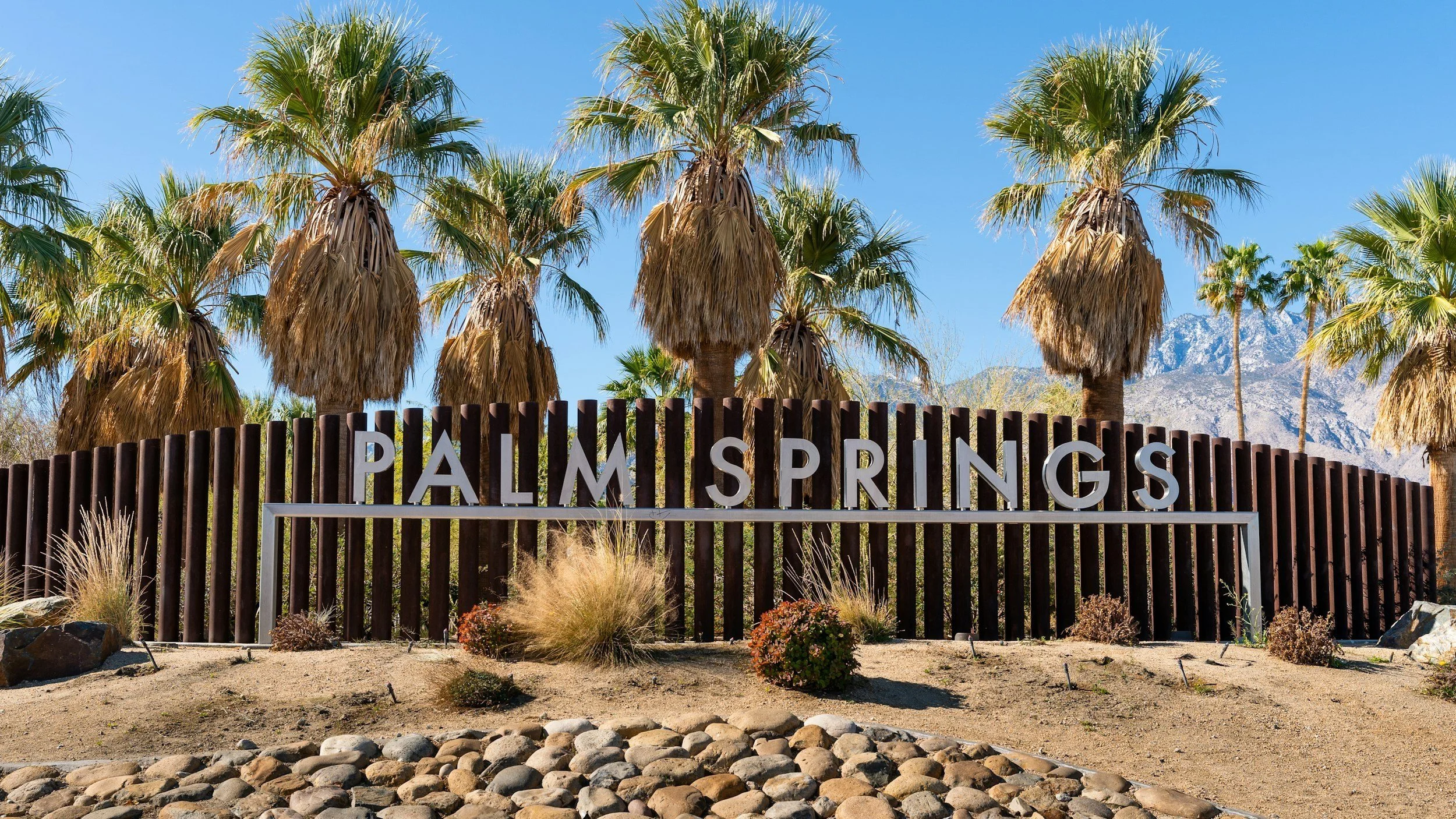 The welcoming sign for Palm Springs, California, set against a backdrop of palm trees and mountains, with a clear blue sky above.