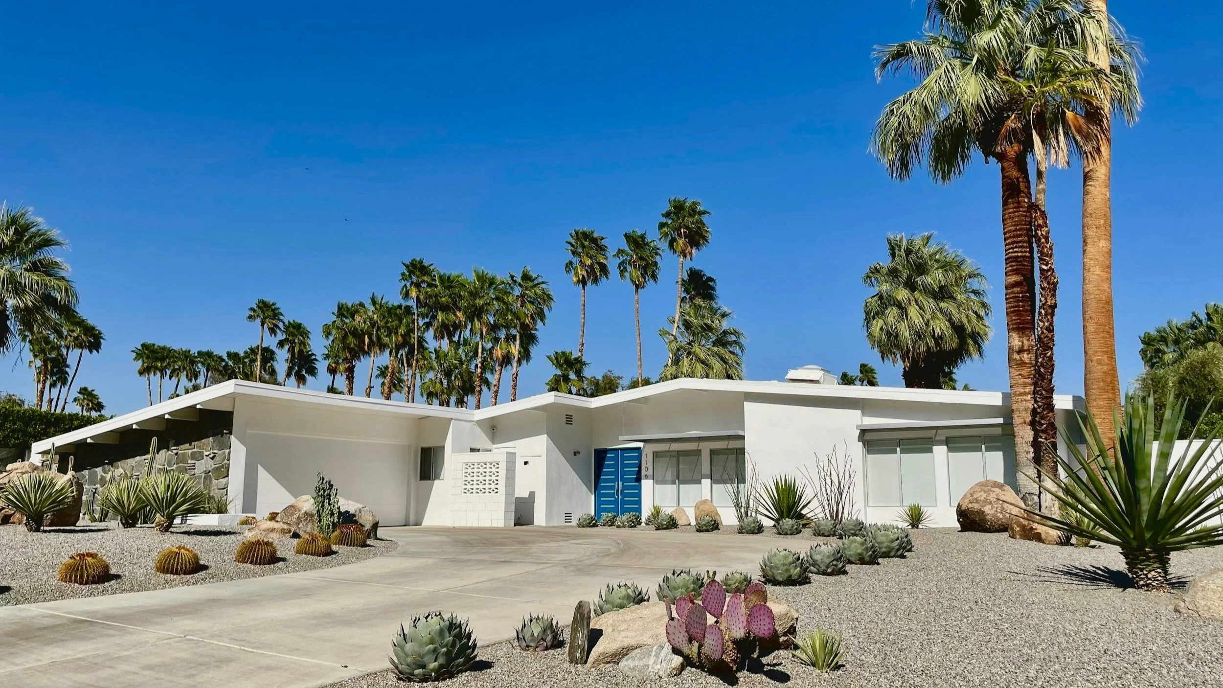 Iconic mid-century modern home in Palm Springs, surrounded by desert landscaping and towering palm trees.